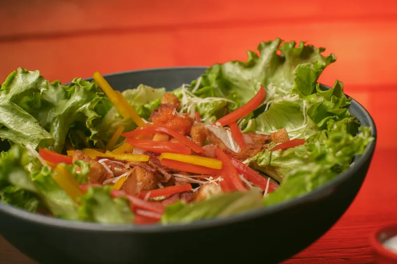 Lechuga hidropónica, queso parmesano rallado, tocino crispy, crutones, pimentones salteados, cebolla, piña y aji encurtidos, yogur ciboulette.