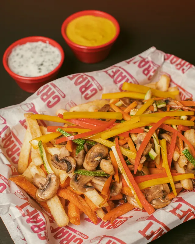 Papas fritas, camote frito, pimentones, zapallo italiano, zanahoria, cebolla encurtida.