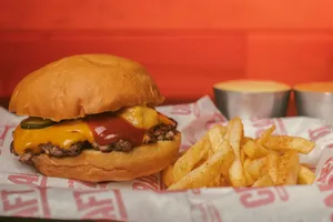Pan de Papa, blend de carne (120 gr), queso americano, pepinillos, cebolla, ketchup, mostaza.